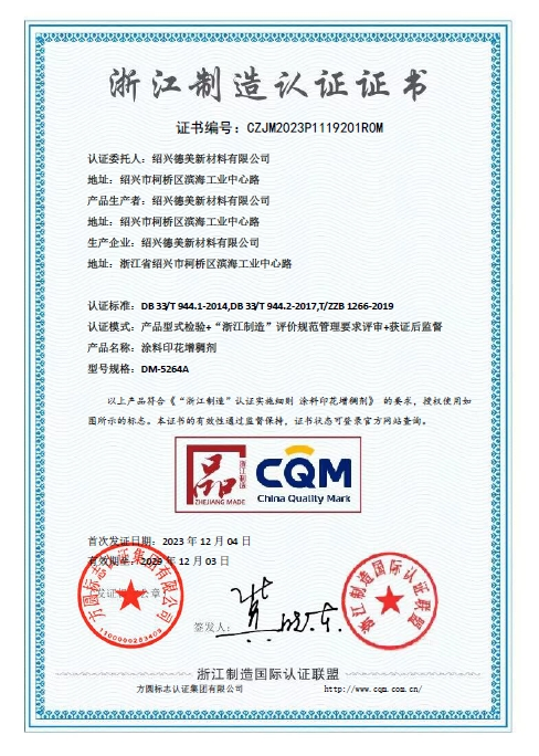 2023年12月4日,经过严格的产品检验、第三方审查等环节,绍兴德美新材料有限公司正式荣获《浙江制造认证证书》,绍兴德美新材料有限公司的产品 “涂料印花增稠剂”成功通过了浙江制造业含金量最高的标准认证,获得了“品字标”。